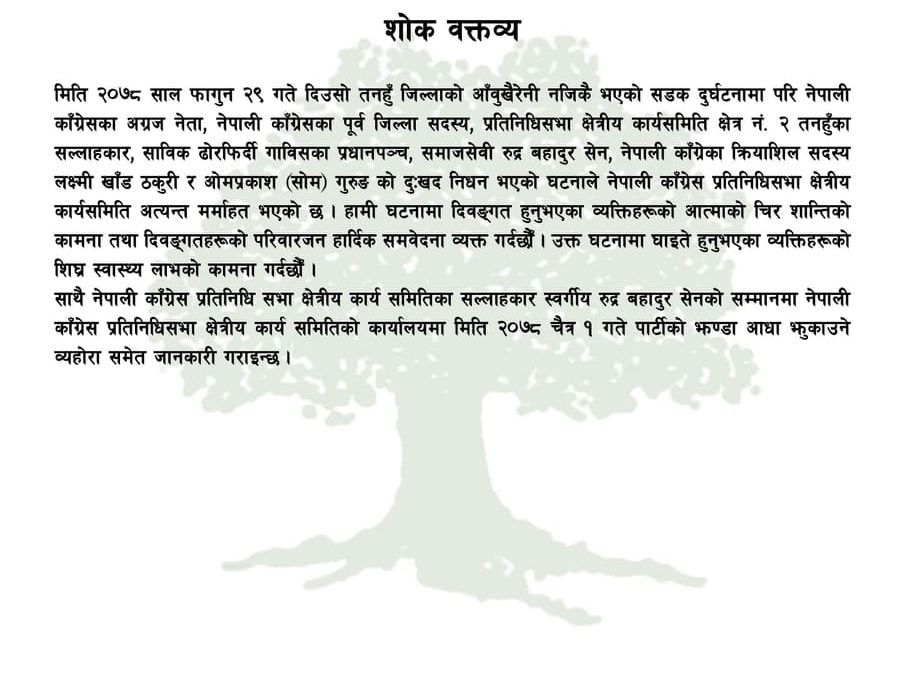 तनहूँ । नेपाली कांग्रेस तनहूँ क्षेत्र नंं २ प्रतिनिधिसभा क्षेत्रिय कार्यसमितिद्धारा नेपाली कांग्रेस क्षेत्रीय कार्यसमितिका सल्लाहकार बाट शोक व्यक्त रुद्रबहादुर सेन, क्रियाशिल सदस्य लक्ष्मी खाँड ठकुरी र ओमप्रकाश( सोम) गुरुगंको निधनप्रति शोक व्यक्त गरेको छ । उहाँहरु तिनै जनाको यहि फागुन २९ गते पृथ्वी राजमार्ग अन्र्तगत आँबुखैरेनीको चुनपहरामा दुर्घटना परि निधन भएको थियो । वक्तब्यमा दिवंगत आत्माको चिरशान्तिको कामना गर्दै दिवंगतजनका परिवारजनप्रति हार्दिक समवेदना व्यक्त गरेको छ साथै वक्तब्यमा उक्त दुर्घटनामा घाईतेहरुको सिघ्र स्वास्थ्य लाभको कामना पनि गरिएको छ ।