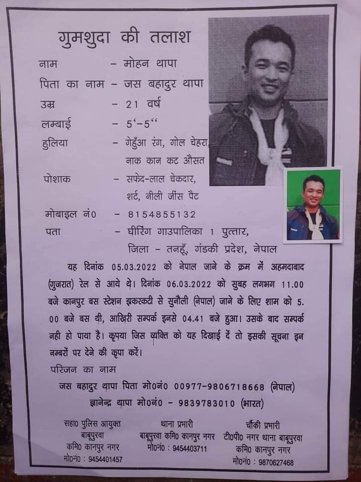 थापा हराएको कानपुर प्रहरीलाई पनि जानकारी दिईसकिएको र थापालाई कतै देख्नु हुने महानुभावहरुले तल उल्लेखित नम्बर खबर गरिदिनुहुन पनि हराईरहेका व्यक्ति मोहनका बुबा जसबहादुर थापाले आग्रह गर्नुभएको छ ।