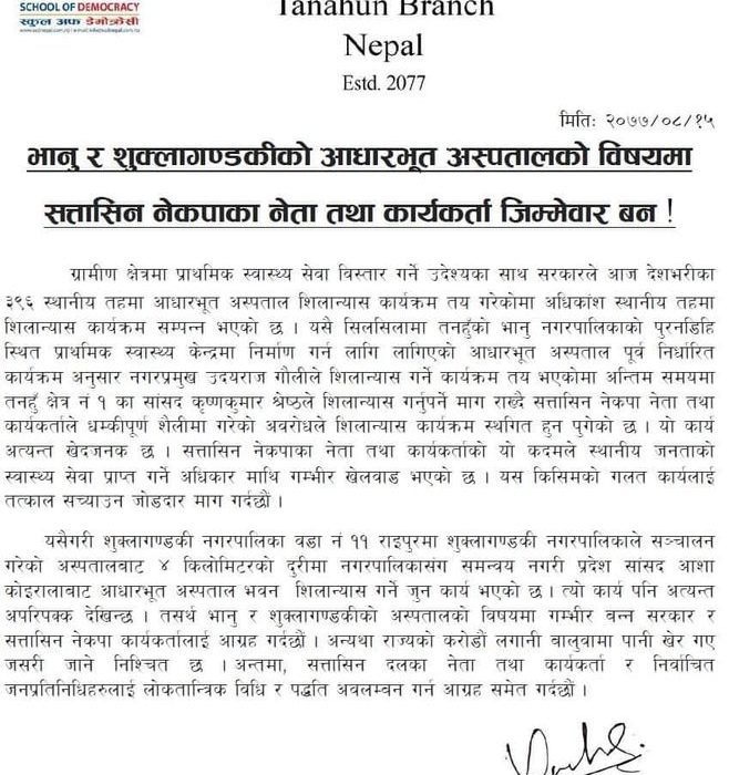 ग्रामीण क्षेत्रमा प्राथमिक स्वास्थ्य सेवा विस्तार गर्ने उद्धेश्यका साथ सरकारले आज देशभरीका ३९६ स्थानीय तहमा आधारभूत अस्पताल शिलान्यास कार्यक्रम तय गरेकोमा अधिकांश स्थानीय तहमा शिलान्यास कार्यक्रम सम्पन्न भएको छ । यसै सिलसिलामा तनहुँको भानु नगरपालिकाको पुरनडिहि स्थित प्राथमिक स्वास्थ्य केन्द्रमा निर्माण गर्न लागि लागिएको आधारभूत अस्पताल पूर्व निर्धारित कार्यक्रम अनुसार नगरप्रमुख उदयराज गौलीले शिलान्यास गर्ने कार्यक्रम तय भएकोमा अन्तिम समयमा तनहुँ क्षेत्र नं १ का सांसद कृष्णकुमार श्रेष्ठले शिलान्यास गर्नुपर्ने माग राख्दै सत्तासिन नेकपा नेता तथा कार्यकर्ताले धम्कीपूर्ण शैलीमा गरेको अवरोधले शिलान्यास कार्यक्रम स्थगित हुन पुगेको छ । यो कार्य अत्यन्त खेदजनक छ । सत्तासिन नेकपाका नेता तथा कार्यकर्ताको यो कदमले स्थानीय जनताको स्वास्थ्य सेवा प्राप्त गर्ने अधिकार माथि गम्भीर खेलवाड भएको छ । यस किसिमको गलत कार्यलाई तत्काल सच्याउन जोडदार माग गर्दछौं ।