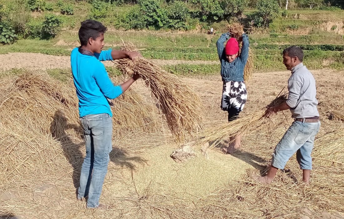 पहाडी भेगमा औसत अन्य स्थानहरुमा चिसो मौषम भएको कारण धान काट्ने बेला अलि पछि हुने गर्दछ । धान थन्क्याउने मौषम सकिन लागेको बेला केहि स्थानहरुमा धान थन्क्याउने चटारो छ । व्यास नगरपालिका वडा नंं ११ को एक खेतमा काम गर्दै खेतालाहरु ।