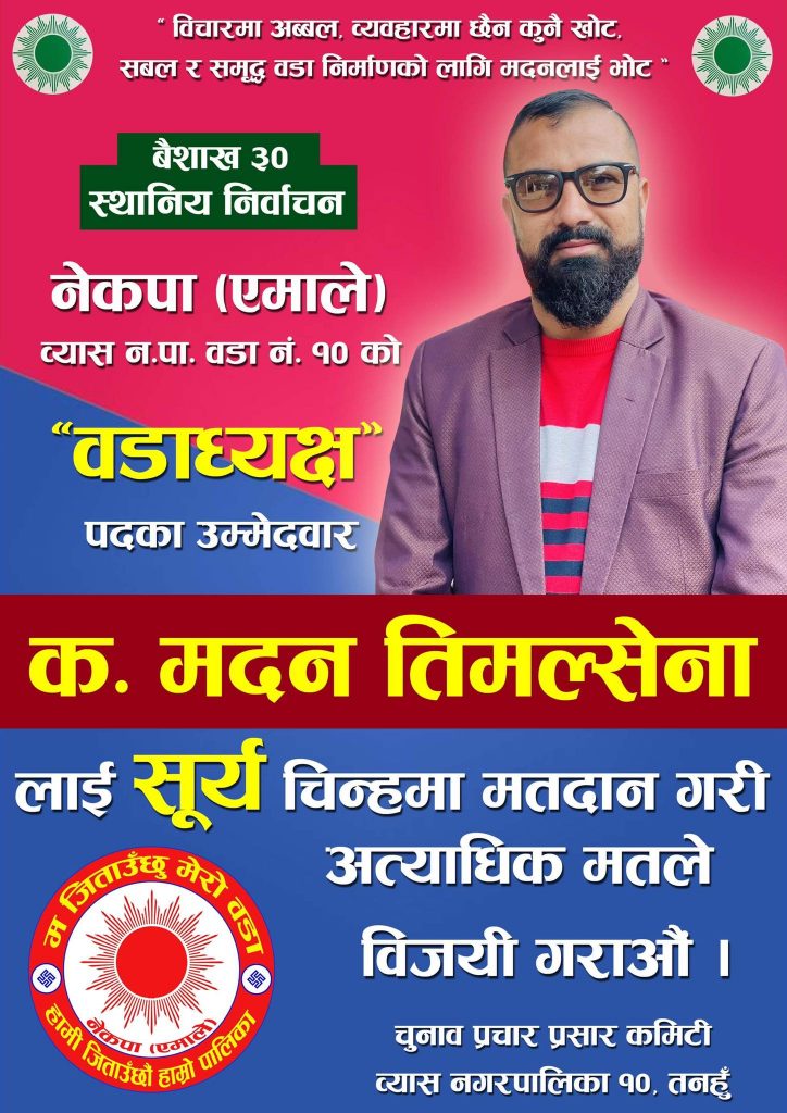 तनहूँ । व्यास नगरपालिका वडा नं. १० को अध्यक्ष पदमा चर्चित युवा नेता मदन तिमल्सेना उमेदवार बन्नुभएको छ । तिमल्सेनाले नेकपा एमालेका तर्फबाट व्यास १० मा उमेदवारी दर्ता गर्नुभएको हो । स्थानिय सरकार भएपनि निवर्तमान जनप्रतिनिधिको भौतिक संरचना निर्माणमा जोड भएकोले वडावासीको लागि आवश्यक शिक्षा , स्वास्थ्य , रोजगारमा बिशेष कार्यक्रमहरु लागु गर्न नसकेकोले आफुले मत पाउने विश्वास लिएको बताउनुभएको छ ।