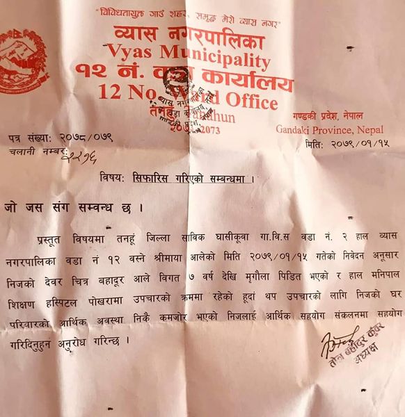 तनहूँ । व्यास नगरपालिका वडा नंं १२ छाब्दी सुमलटारी निवासी मृगौला पिडित चित्र बहादुर आलेले सहयोगको लागि अपिल गर्नुभएको छ । मृर्गौलामा समस्या देखिएपछि विगत ७ बर्षदेखि पोखराका विभिन्न अस्पताल र हाल दमौली अस्पतालबाट हप्ताको २ पटक डाईलसिस गरिरहनुभएका आलेले आर्थिक अवस्था कमजोर भएको कारण उपचार गर्न नसकेकोले उपचारको लागि अपिल गर्नुभएको हो । हप्ताको २ पटक डायलासिस गर्दा आलेको स्वास्थ अवस्थामा केहि सुधार आएपनि क्रमिक रुपमा उपचार गर्नुपर्ने हुदा आर्थिक अवस्था निकै कमजोर भएको हुदा सहयोगी मनहरुलाई खुलेर सहयोग गरिदिनुहुन अनुरोध गर्नुभएको छ । उहाँलाई कसैले सहयोग गर्न चाहनुहुन्छ भने ईन्द्र कडेंल, किरन आले मगर, गोविन्द मगर, दिनेश रानाभाट, दिनेश आईडु र प्रेम थापालाई सम्पर्क गर्न सक्नुहुनेछ ।