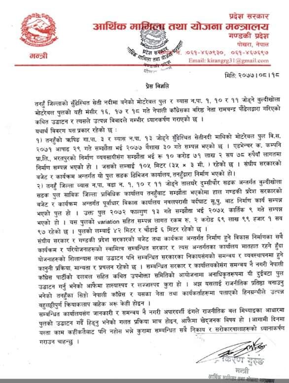 तनहूँ । मंसिर १८ । पछिल्लो ३ दिन तनहूँ जिल्लाको तापक्रम निकै बढ्यो, नेपाली कांग्रेसका वरिष्ठ नेता रामचन्द्र पौडेलले जिल्ला प्रशासन कार्यालयको अनुरोध तथा आग्रहलाई वेवस्ता गर्दै पुल उट्घाटनमा सरिक हुन पुग्नुभयो, बुधवारको दिन त सत्तारुढ दलका कार्यकर्ताहरु जिल्ला प्रशासनमा विधि नियम कानुन मिचेर पुल उद्घाटन गर्दै हिड्ने कार्यलाई रोक्न माग गर्दै ठुलो प्रर्दशन गरियो । सत्तापक्षकै केहि कार्यकर्तालाई प्रहरीले गिरफ्तार पनि गर्यो सम्भावित भिडन्तलाई मध्यनजर गर्दै जिल्ला प्रशासन कार्यालय तनहूँले निषेधआज्ञा जारी गर्यो तर वरिष्ठ नेता टसको मस हुनु भएन दलबल सहित उद्घाटनस्थल जाँदा प्रहरीले वहाँलाई नियन्त्रणमा लियो र ३ घण्टापछि मुक्त गर्यो । बिहिवार दलबल सहित नेपाली कांग्रेसका थुप्रै नेता तथा कार्यकर्ता सहित पगेर रामचन्द्र पौडेल उक्त पुल उद्घाटन गरियो तर त्यस्को बारेमा सबैले आ आफ्नो अड्कल गरे कसैले सरकारले पौडेल माथि अन्याय गरेको भने भने कसैले पौडेलले मैले नै उद्घाटन गर्नुपर्छ भनेर विधि प्रक्रिया मिचेको आरोप लगाए यसै सम्बन्धमा गण्डकी प्रदेशका आर्थिक मामिला तथा योजना मन्त्रालय मन्त्री किरण गुरुगंले एउटा विज्ञप्ति निकाल्नु भएको छ विज्ञप्तिका अनुसार उक्त दुबै पुलको सम्बन्धित सरकार र कार्यालयसग समन्वय नै नगरि नेपाली कांग्रेस पार्टीको दलबल सहित अनाधिकृतरुपमा उद्घाटन गरिनु अनाधिकृतरुपमा यी दुईवटा पुल उद्घाटन गर्नु भनेको आफैमा हास्यास्पद र लज्जास्पद कुरा हो । विज्ञप्ति अनुसार सुडेको पुल संघिय सरकारको बजेट र कार्यक्रम अन्र्तगत यो पुल सडक डिभिजन कार्यालय तनहूँद्धारा निर्माण सम्पन्न हो भने व्यास नगरपालिका वडा नं १, १० र ११ तालघरे दुम्सिचौर सडक अन्र्तगत बुल्दीखोला सडकपुल साविक जिल्ला प्राविधिक कार्यालय तनहूँबाट सम्झौता भएकोमा हाल गण्डकी प्रदेश सरकारको बजेट कार्यक्रम अन्र्तगत पुर्वाधार बिकास कार्यालय नवलपरासी वर्दघाट सू.पू. बाट निर्माण कार्य सम्पन्न भएको हो भन्ने लेखिएको छ मन्त्री गुरुगंद्धारा विज्ञप्ति जस्ताको तस्तै