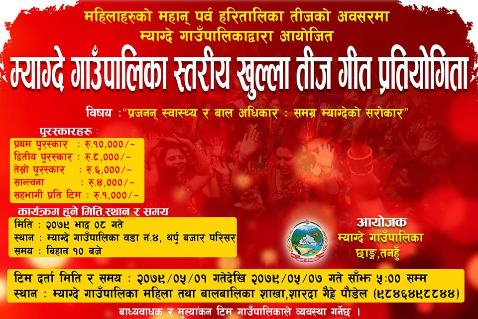 भाद्र ८ गते का दिन वडा नं. ४ को थर्पु बजारमा हुने प्रतियोगितामा सहभागी हुनेहरुले प्रजनन् स्वास्थ्य र बाल अधिकारः समग्र म्याग्देको सरोकार बिषयमा गितहरु प्रस्तुत गर्न सक्ने आयोजक म्याग्दे गाउँपालिकाले जनाएको छ ।