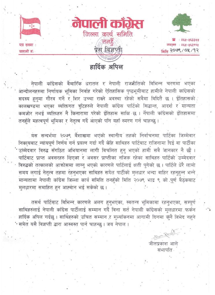 नेपाली कांग्रेस तनहूँका सभापति जीतप्रकाश आलेद्धारा आइतबार जारी विज्ञप्तिमा स्थानिय तहको निर्वाचन २०७९ मा पार्टीको जिम्मेवार निकायबाट न्यापुर्ण निर्णय गर्न प्रयत्न गर्दागर्दै केहि साथीहरु पार्टीबाट राजिनामा दिई वा पार्टीका उमेदवार विरुद्ध संगठित अभियानमा लागि विचलित हुनुभएको पार्टीलाई क्षति पुगेको छ त्यसैले पार्टी नेतृत्वमा धेरै लामो समयसम्म रहनुभएका साथीहरु पार्टी मुलधारभन्दा बाहिर रहनुहुन्न भन्ने मान्यतालाई आत्मसात गर्दै नेपाली कांग्रेस जिल्ला कार्य समितिको भाद्र ९ मा बसेको पुर्ण बैठकले सबैलाई बिना सर्त मुलधारमा फर्कन आव्हान गरेको छ भनिएको छ ।