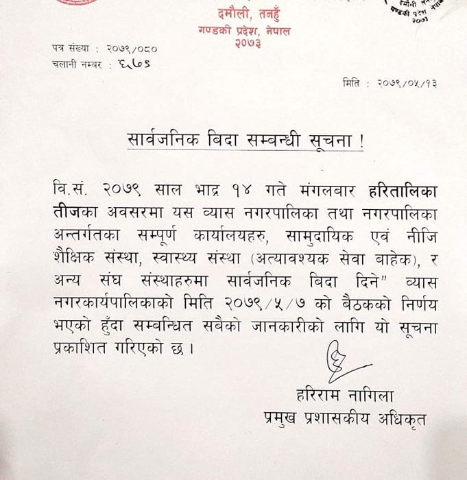 व्यास नगरपालिकाका प्रमुख प्रसाशकिय अधिकृत हरिराम नागिलाद्धारा जारी सूचनामा मंगलवार हरितालिका तिजका अवसरमा सम्पूर्ण कार्यालयहरु, सार्वजनिक तथा निजी शैक्षिक सैस्था, स्वास्थ्य संस्था (अत्यावश्यक बाहेक) र अन्य संघसंस्थाहरुमा सार्वजनिक विदा दिने व्यास नगर कार्यपालिकाको भाद्र ७ को निर्णय अनुसार सूचना प्रकाशित गरेको जनाईएको छ ।