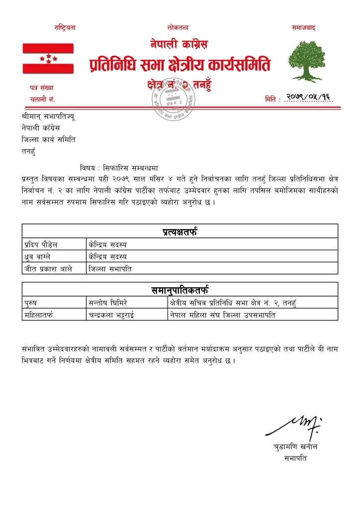 तनहूँ । मंसिर ४ मा हुन लागेको प्रतिनिधिसभा सदस्यको उमेदवारको लागि तनहूँ क्षेत्र नंं २ बाट प्रदिप पौडेल, धुर्व वाग्ले र जितप्रकाश आले सिफारिश हुनुभएको छ । तनहूँका कांग्रेस क्षेत्र नं. २ का सभापति चुडामणी खनालका अनुसार केन्द्रको परिपत्र र बिधानले दिएको अधिकारलाई सिरोधार गरि बिहिवार बसेको क्षेत्रीय कार्यसमिति, महासमिति सदस्य, महाधिवेशन प्रतिनिधि र प्रदेश प्रतिनिधिको संयुक्त बैठकले प्रदिप पौडेल, धुर्व वाग्ले र जितप्रकाश आलेको नाम सिफारिस गर्ने सर्बसहमतिमा निर्णय गरिएको बताउनुभएको छ ।