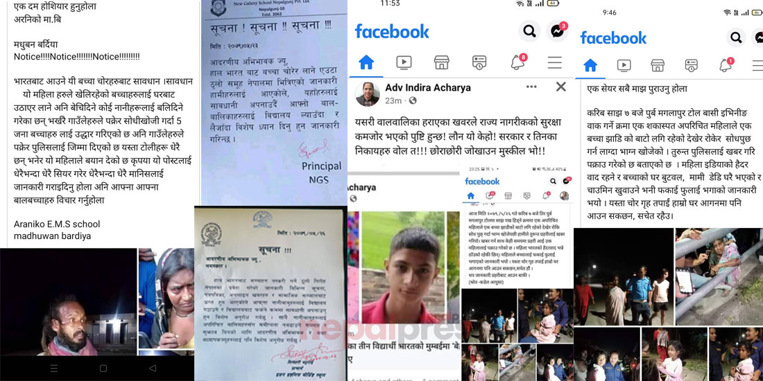 आइतबार मात्रै साँझ ७ बजे रुपन्देहीको पूर्व मंगलापुर टोलमा एक शंकास्पद अपरिचित महिलाले एक बच्चा जंगलको बाटो लगिरहेको देखेर रोकेर सोधपुछ गर्न लाग्दा भाग्न खोजेको र तुरुन्त पुलिसलाई खबर गरि पक्राउ गरेको विषय सामाजिक सञ्जालमा भाइरल बनेको छ ।