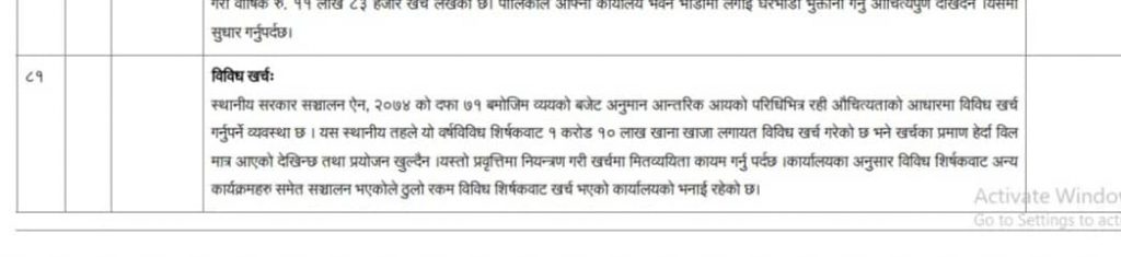 यसै बिषयमा भर्खरै उक्त पालिकाको प्रमुख प्रशासकिय अधिकृत हरिराम नागिलासग सम्पर्क गर्दा ”यो मेरो कार्याकालको कुरा त भएन तैपनि खाजा , खानामा १ करोड १० लाख खर्च भनेको त जनताको राजश्व दुरुपयोगको चरम पराकाष्ट हो, मेरो कार्यकालमा १ रुपैया पनि त्यस्तो हुन दिन्न” भन्नुभएको छ ।