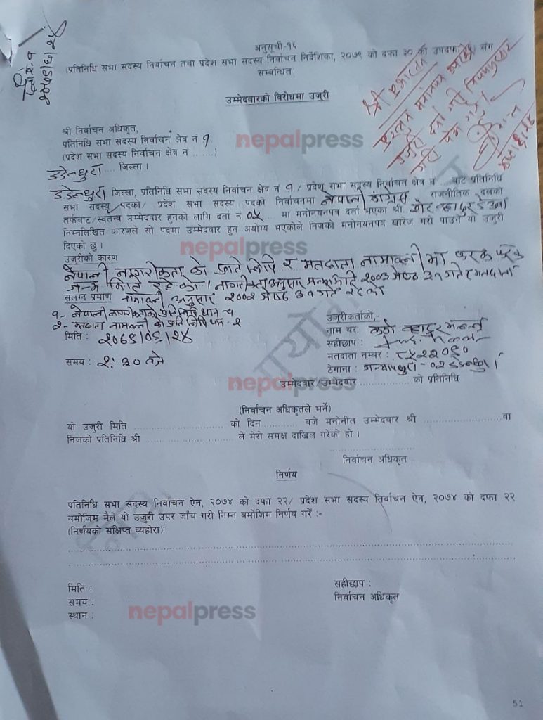 नागरिकता र मतदाता नामावलीमा फरक फरक मिति रहेको भन्दै उनको उम्मेदवारी विरुद्ध उजुरी परेको छ ।