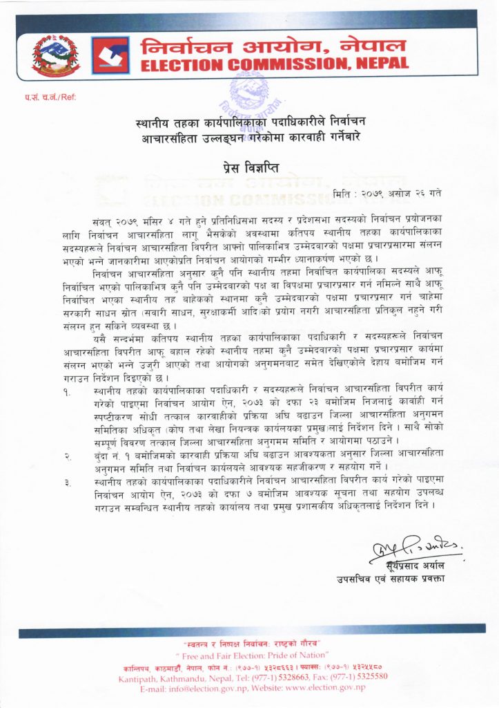 आयोगका प्रवक्ता शर्माले बुधबार एक विज्ञप्ति जारी गर्दै त्यसरी उम्मेदवारको पक्षमा प्रचारप्रसारमा संलग्न भएको पाइए कारबाही गरिने उल्लेख गरेका छन् । प्रतिनिधिसभा सदस्य र प्रदेशसभा सदस्यको निर्वाचन प्रयोजनका लागि निर्वाचन आचारसंहिता लागू भैसकेको अवस्थामा कतिपय स्थानीय तहका कार्यपालिकाका सदस्यहरूले निर्वाचन आचारसंहिताविपरीत आफ्नो पालिकाभित्र उम्मेदवारको पक्षमा प्रचारप्रसारमा संलग्न भएको भन्ने जानकारीमा आएकोप्रति निर्वाचन आयोगको गम्भीर ध्यानाकर्षण भएको छ, आयोगले भनेको छ, कतिपय स्थानीय तहका कार्यपालिकाका पदाधिकारी र सदस्यहरूले निर्वाचन आचारसंहिताविपरीत आफू बहाल रहेको स्थानीय तहमा कुनै उम्मेदवारको पक्षमा प्रचारप्रसार कार्यमा संलग्न भएको भन्ने उजुरी आएको तथा आयोगको अनुगमनबाट समेत देखिएको छ ।