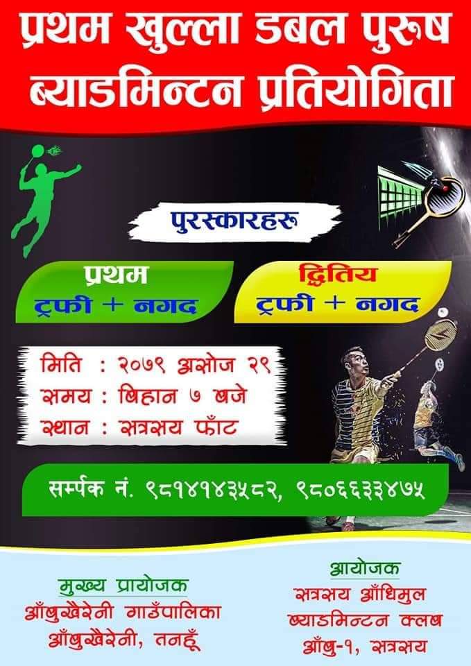 बाबुराम नेपाली। आँबुखैरेनी तनहूँ । दशैं,तिहार तथा छठ पर्वको उपलक्ष्यमा मिति २०७९ साल असोज २९ गते शनिबार सत्रसय फाँट स्थित ब्याडमिन्टन कोर्टमा प्रथम खुल्ला पुरुष डबल ब्याड्मिन्टन प्रतियोगिता हुन गइरहेको छ । प्रतियोगिता बिहान ठिक ७ बजे शुरु हुने जानकारी क्लबका सदस्य बालकृष्ण थापाले दिनुभएको छ । सत्रसय आँधिमुल ब्याडमिन्टन क्लबले आयोजना गर्न लागेको सो प्रतियोगितामा स्थानिय तहका बी र सी लेभलका खेलाडीहरुको सहभागिता रहनेछ । लिग कम नकाउट शैलीमा खेलाइने सो प्रतियोगितामा प्रथम तथा द्वितीय हुने टीमलाई ट्रफी, पदक तथा नगद पुरस्कार सहित प्रमाणपत्र प्रदान गरिनेछ भने तृतीय हुने टीमलाई पदक, नगद पुरस्कार र प्रमाणपत्र प्रदान गरिने कुरा उक्त क्लबका संयोजक कर्ण बहादुर गुरुङले जानकारी गराउनु भयो । बिक्रम सम्वत २०७४ साल भाद्रमा स्थापना गरिएको सो क्लबले चारवटा प्रतियोगितामा सहभागी भएर दुइवटा प्रतियोगतामा बिजेता बनिसकेको भएता पनि क्लब आफैले प्रतियोगिता सन्चालन गर्न लागेको भने यो प्रथम पटक हो । आँबु खैरेनी गाउँ पालिकाको मुख्य प्रायोजनमा संचालन हुन गइरहेको सो प्रतियोगितामा प्रवेश शुल्क प्रत्येक टीमको रु. १,०००/ तोकिएको छ ।