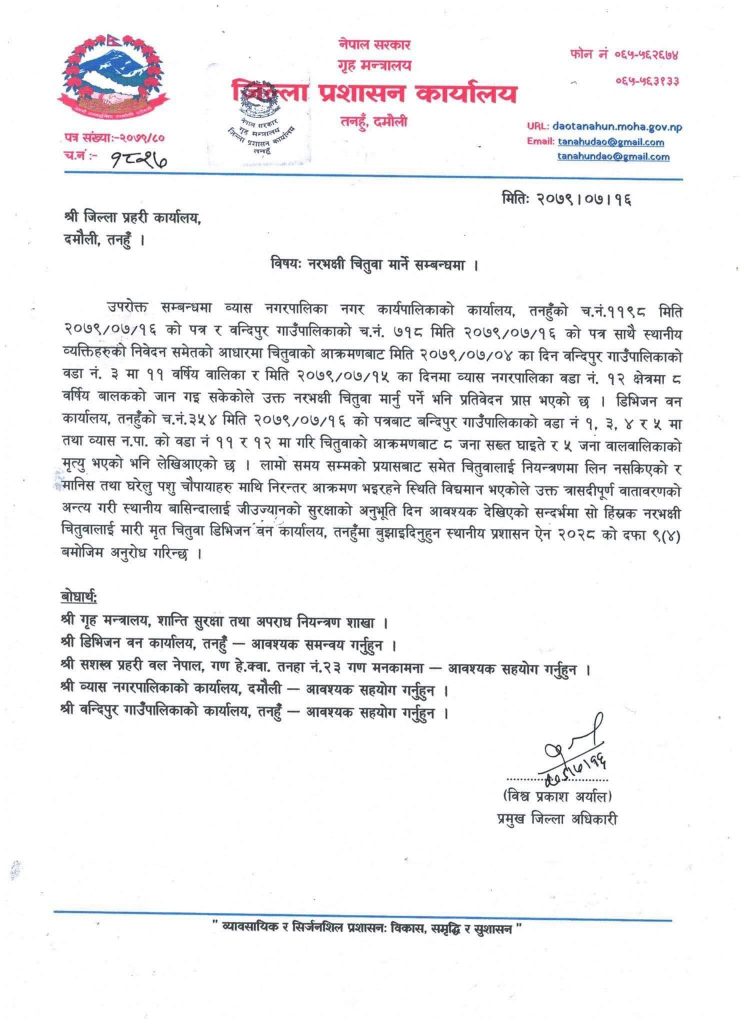 जिल्ला प्रशासन कार्यालय तनहूँका प्रमुख एवं प्रमुख जिल्ला अधिकारी विश्ब प्रकाश अर्यालद्धारा प्रेषित पत्रमा व्यास नगरपालिका, भानु नगरपालिका, बन्दिपुर गाउँपालिका र विभिन्न स्थानिय व्यक्तिहरुको निवेदनको आधारमा उक्त नरभक्षी चितुवा मार्नुपर्ने प्रतिवेदन प्राप्त भएकोले उक्त चितुवा मार्न बुझाउन अनुरोध गरिएको छ ।