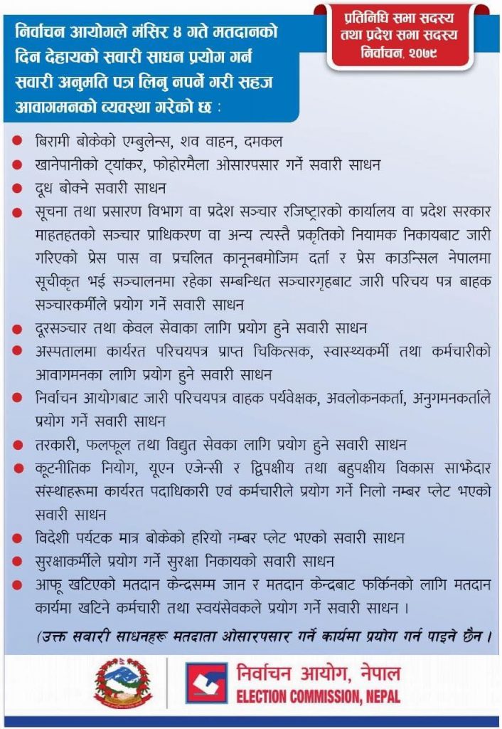 निर्वाचन आयोगले बिरामी बोकेको एम्बुलेन्स, शववाहन, दमकल, खानेपानीको ट्यांकर, फोहोरमैला ओसारपसार गर्ने सवारी साधन, दूध बोक्ने सवारी साधन सञ्चालन गर्न दिइनेछ ।