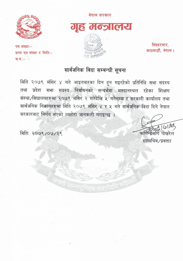 मंसिर ४ को निर्वाचनलाई लक्षित गर्दै गृहमन्त्रालयले सार्वजनिक बिदासम्बन्धी निर्णय गरेको छ ।