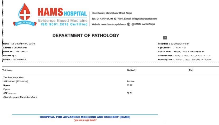 काठमाण्डौ । पूर्व मन्त्री नेपाली कांग्रेसका पूर्व सह महामन्त्री गोविन्द राज जोशी लाई कोरोना संक्रमण पुष्टि भएको छ । अस्पतालमा उपचाररत वहाँको स्वास्थ्य अवस्था हाल सामान्य रहेको छ । डाक्टरहरुले कोरोना माइल्ड रहेको र आफ्नो निवासमा आईसोलेसन बस्दा पनि हुने भनेकोमा केहिदिन यता अक्सिजन लेभल कम भए पछी वहाँलाई अब्जरभेसन को लागि काठमाण्डौको ह्याम्स अस्पताल हस्पिटलमा भर्ना गराइएको छ। वहासंग नजिकको सम्पर्कमा रहेका सवैले आवश्यकता अनुसार परिक्षण गर्नु गर्न लागिएको वहाँको पारिवारिक श्रोतको भनाई रहेको छ ।