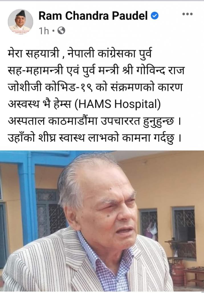 तनहूँ । नेपाली कांग्रेसका वरिष्ठ नेता रामचन्द्र पौडेलले पूर्वमन्त्री तथा नेपाली कांग्रेसका पूर्व सह महामन्त्री गोविन्दराज जोशीको स्वस्थ्लाभको स्वास्थलाभको कामना गर्नुभएको छ । कोरोना कोभिड १९ बाट संक्रमित भएपश्चात जोशी राजधानीको हेम्स अस्पतालमा उपचाररत हुनुहुन्छ । वरिष्ठ नेता पौडेलले फेसबुक पेजमा ‘मेरा सहयात्री , नेपाली कांग्रेसका पुर्व सह महामन्त्री एवं पुर्व मन्त्री श्री गोविन्द राज जोशीजी कोभिड १९ को संक्रमणको कारण अस्वस्थ भै हेम्स ( Hams Hospital)अस्पताल काठमाडौंमा उपचाररत हुनुहुन्छ ।
