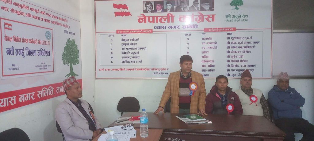 तनहूँ । वित्तिय संस्था कर्मचारी संघ तनहूँको अधिवेशन सम्पन्न भएको छ । ट्रेड युनियन तनहूँका अध्यक्ष एवं नेपाली कांग्रेस व्यास नगरका सभापति सूर्यचन्द्र हड्खलेको प्रमुख आतिथ्यतामा उक्त अधिवेशन विपि भवन दमौलीमा सम्पन्न भएको हो । उक्त अवसरमा प्रमुख अतिथि हड्खलेले सम्पूर्ण मजदुरहरु आ आफ्नो संघ संगठनमा संगठित भएमात्र संघ संगठन बलियो हुने र सफलता पाउने बताउनुभएको थियो ।