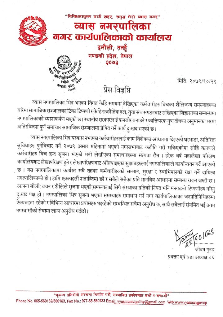 तनहूँ । प्रमुख प्रशासकिय अधिकृत र कर्मचारीको द्धन्दले काम कारवाही लामो समयदेखि अवरुद्ध भएको व्यास नगरपालिकाले आज एक विज्ञप्ति जारी गरिएको छ । पौष २१ गते देखि प्रमुख प्रशासकिय अधिकृत कर्मचारीबिच भएको विवाद छताछुल्ल भएपनि विज्ञप्ति निकाल्न कुनै प्रयास नगरेको नगरपालिकाले आज आईतबार एक विज्ञप्ति जारी गर्दै ”विगत केहि समयमा देखिएका कर्मचारीहरु विचका शैलिजन्य समस्याहरुका बारेमा सामाजिक सञ्जालका टिका टिप्पणी र केहि राजनैतिक दल, युवा संघ संगठनबाट राखिएका जिज्ञासाका सम्बन्धमा नगरपालिकाको ध्यानाकर्षण भएको र उक्त कार्य स्थानीय सरकारलाई कमजोर बनाउने र व्यक्तिपरक गुण दोषका अनुमानका भरमा अतिरञ्जिना पुर्ण समाचार सामाजिक सञ्जालमा प्रेषित गर्ने कार्य दुःखद भएको ” जनाएको छ । साथै विज्ञप्तिमा ”व्यास नगरपालिका भित्र घरबास नभएका कर्मचारीहरुलाई काम विशेषका आधारमा दिइएको घरभाडा, अतिरिक्त सुविधाहरु पुर्नविचार गर्न २०७९ असार महिनामा भएको नगरसभाबाट कटौति गरी सकिएकोमा सोहि कारणले कर्मचारीहरुविच द्वन्द सृजना भएको भनी लेखीएका समाचारहरुमा सत्यता छैन । हरेक वर्ष महालेखा परिक्षण कार्यालयबाट लेखापरिक्षण हुने र लेखापरिक्षणबाट औंल्याइएका सुझाबहरुलाई नगरपालिकाले कार्यान्वयन गर्दै आएको छ” भन्ने उल्लेख गरिएको छ ।