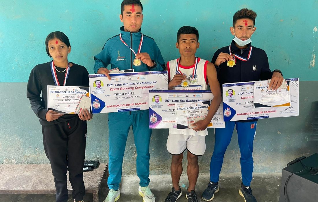 तनहूँ । रोटर्याक्ट क्लव अफ दमौलीले आफ्नो संस्थापक सहसचिव स्व. सचिन कुमार श्रेष्ठको स्मृतिमा आइतबार आयोजना गरेको २०औ स्व.रो.सचिन स्मृति खुल्ला दौड प्रतियोगिताको उपाधि गोरखाको सिरानचोक गाउँपालिका ३ का दिनेश सिंह बोगटीले जितेका छन ।
