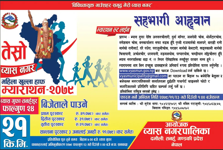 तनहूँ । व्यास नगरपालिकाको आयोजनामा यहि फागुन २४ गतेका दिन महिला खुला हाफ म्याराथन प्रतियोगिता हुन गईरहेको छ । अन्तराष्ट्रिय नारी दिवसको अवसरमा महिला खुला हाफ म्याराथन प्रतियोगिता गर्न लागिएको सोमबार आयोजित पत्रकार सम्मेलनमा जानकारी दिईएको थियो । व्यास नगरपालिका वडा नं. ३ दमौली बजारको पवित्र व्यास गुफा बाट शुरु हुने उक्त म्याराथन प्रतियोगिता व्यास ११ को ऐतिहासिक स्थल तनहूँसुरमा पुगेर समापन हुने पनि उक्त अवसरमा बताईएको थियो ।