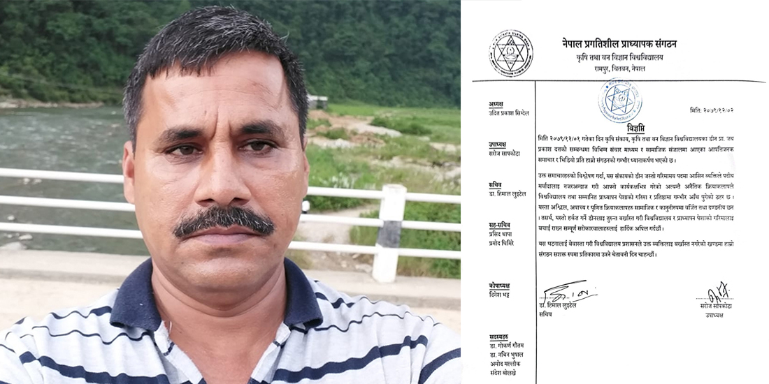 नेपाल प्रगतिशील प्राध्यापक संगठन कृषि तथा वन विज्ञान विश्वविद्यालयले बिहीबार प्रेस वक्तव्य जारी गर्दै कार्यकक्षभित्रै अनैतिक हर्कत गर्ने डीनलाई निलम्बन होइन बर्खास्त गर्न माग गरेको छ । उपाध्यक्ष सरोज सापकोटा र सचिव डा. हिमाल लुइटेलले जारी गरेको विज्ञप्तिमा दत्तलाई बर्खास्त नगरे सशक्त प्रतिकारमा उत्रिने चेतावनी दिइएको छ ।