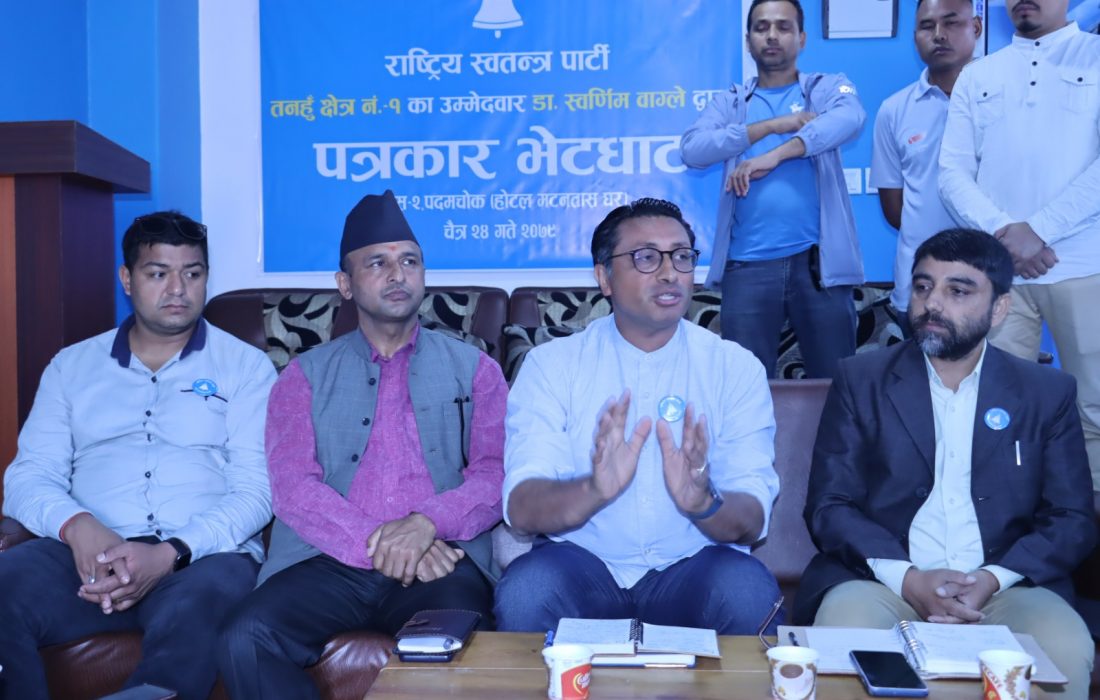 तनहूँ । तनहूँ क्षेत्र नं १ बाट आसन्न प्रतिनिधि सभा उपनिर्वाचनका घण्टी बाहक उम्मेदवार डा. स्वर्णिम वाग्लेले शुक्रबार दमौलीमा पत्रकार सम्मेलन गरि औपचारीक रुपमा चुनाबि अभियान सुरुवात गर्नुभएको छ । अर्थबिद् वाग्ले राष्ट्रिय स्वतन्त्र पार्टिको तर्फबाट उक्त क्षेत्रमा उम्मेदवारको रुपमा आउनुभएको हो ।