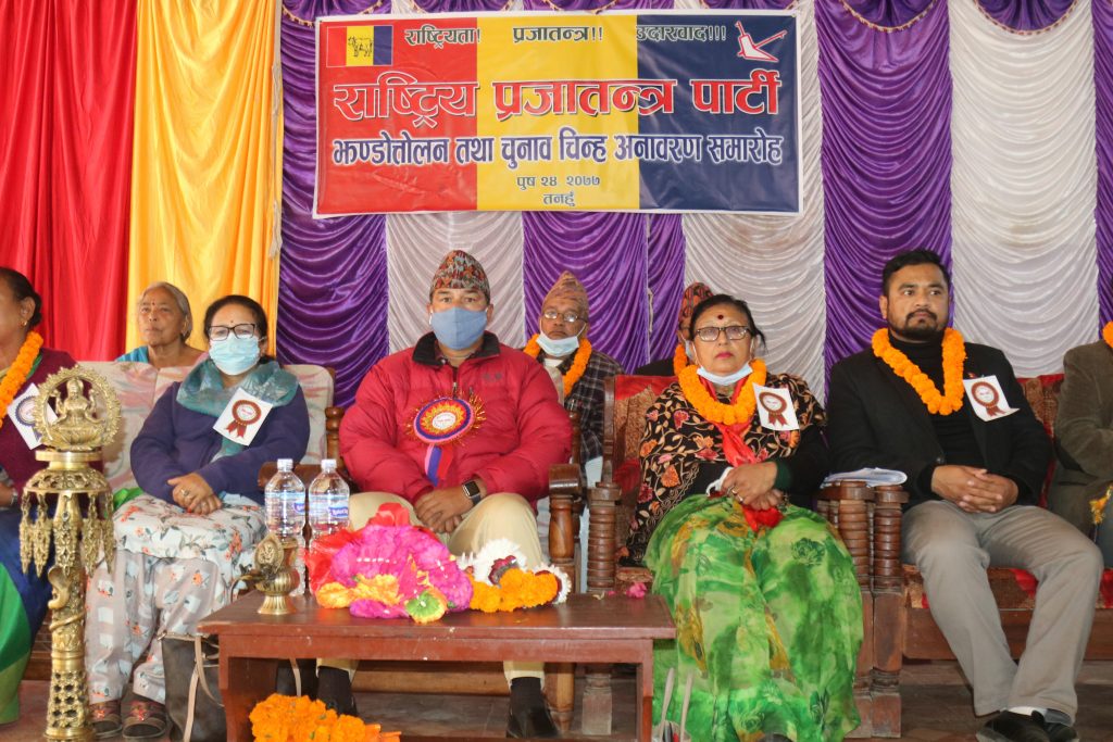 कार्यक्रममा पुर्व मन्त्री दुर्गा श्रेष्ठ, केन्द्रीय सदस्य गौमाया श्रेष्ठ , पार्टी नेता सोमबहादुर गुरुङ , केन्द्रीय सदस्य राजेन्द्र अधिकारी, ,लमजुङ जिल्लाका पुर्व पार्टी सभापति हेमजंग गुरुङ लगायतले हिन्दु राष्ट्र र राजसंस्था गएपछि देश झन् अधोगतिमा गएको भन्दै चिन्ता व्यक्त गर्नुभएको थियो । राष्ट्रिय प्रजातन्त्र पार्टी तनहूँका अध्यक्ष विनोद घर्तिको सभापतित्वमा भएको कार्यक्रममा सबै वक्ताहरुले राष्ट्र ,राष्ट्रियता, प्रजातन्त्र उदारवाद भन्ने पार्टीको मुल नारालाई आत्मा साथ गर्दै सबै स्थानीय तहहरुमा एक ढिक्का राष्ट्रबादी शक्ति एक भएर लाग्नुपर्नैमा जोड दिनुभएको थियो । सोहि अवसरमा राष्ट्रिय प्रजातान्त्र पार्टीमा स्थापनाको चरणदेखि नै कटिबद्ध भएर लाग्नुभएका ११ जना पार्टीका अगुवाहरुलाई दोसल्ला ओढाएर सम्मान गर्नुका साथै नेपाली काँग्रेस र नेकपा परित्याग गरि राप्रपा प्रवेश गर्नुभएका ३ जना महानुभावलाई फुलमाला र खाँदा लगाएर पार्टी प्रवेश गराईएको थियो ।