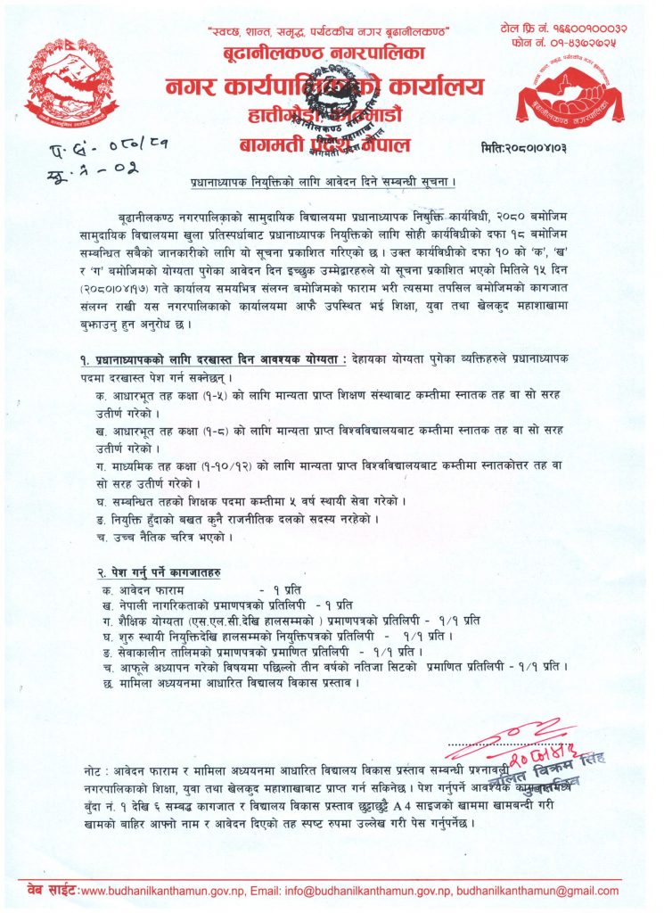 ‘बूढानीलकण्ठ नगरपालिकाको सामुदायिक विद्यालयमा प्रधानाध्यापक नियुक्ति कार्यविधी २०८० को दफा १० को ‘क’, ‘ख’ र ‘ग’ र दफा २८ बमोजिम बूढानीकण्ठ नगरपालिकाभित्रका सामुदायिक विद्यालयको स्थायी शिक्षकको रूपमा कार्यरत शिक्षकले आवेदन दिन सक्नेछन्। साउन १७ गतेभित्र आवेदन दिइसक्नुपर्ने पनि सूचनामा जनाईएको छ ।