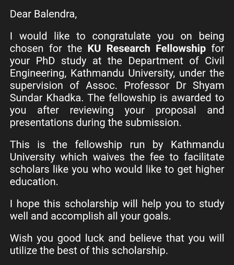 शनिबार सामाजिक सञ्जालमा लेख्दै काठमाडौं विश्वविद्यालयले उनलाई पिएचडीका लागि फेलोसिप दिएको जानकारी दिएका छन्।