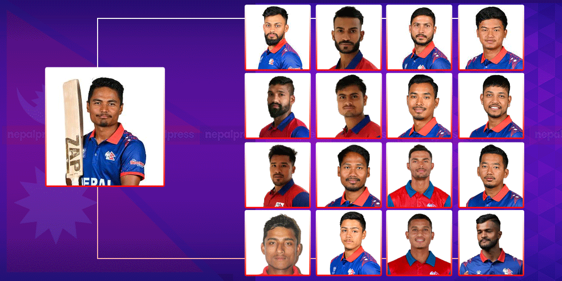 १७ सदस्यीय टोलीमा रोहित पौडेल (कप्तान), कुशल भुर्तेल, सन्दिप लामिछाने, करन केसी, ललित राजबंशी, भीम सार्की , कुशल मल्ल, दीपेन्द्रसिंह ऐरी र गुल्सन झा छन् । यस्तै, आरिफ शेख, आसिफ शेख, सोमपाल कामी, प्रतिस जिसी, किशोर महतो, सन्दिप जोरा, अर्जुन साउद र श्याम ढकाल पनि नेपाली टोलिमा छन् ।