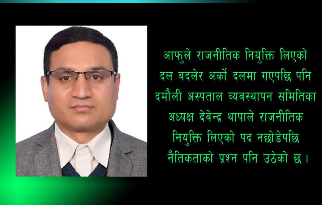 तनहूँको दमौलीमा रहेको दमौली अस्पताल व्यवस्थापन समितिका अध्यक्ष देवेन्द्र थापा माओवादी, नयाँ शक्ति हुदै जनता समाजवादी पार्टी र उपेन्द्र यादवको समाजवादी पार्टीमा आवद्ध रहदा स्थानिय निकायको निर्वाचन अघि राजनीतिक नियुक्तिमा गण्डकी प्रदेश सरकार अन्तर्गत रहेको दमौली अस्पताल व्यवस्थापन समितिको अध्यक्ष बन्नुभएको थियो । राजनीतिक नियुक्ति पाएको दमौली अस्पतालको अध्यक्षको रुपमा कायम रहदा रहदै केहि समय अगाडिदेखि थापा रवि लामिछानेको राष्ट्रिय स्वतन्त्र पार्टीमा आवद्ध हुनुभएको छ । तत्कालिन समयका नेपाली कांग्रेसका वरिष्ठ नेता रामचन्द्र पौडेल नेपालको राष्ट्रपतिमा निर्वाचित भएपश्चात तनहूँ क्षेत्र नं. १ को गत बैशाषमा भएको उपनिर्वाचनमा राष्ट्रिय स्वतन्त्र पार्टीका उमेदवार डा. स्वर्णिम वाग्लेको पक्षमा दमौली अस्पताल व्यवस्थापन समितिका अध्यक्ष देवेन्द्र थापा लाग्नुभएको थियो ।