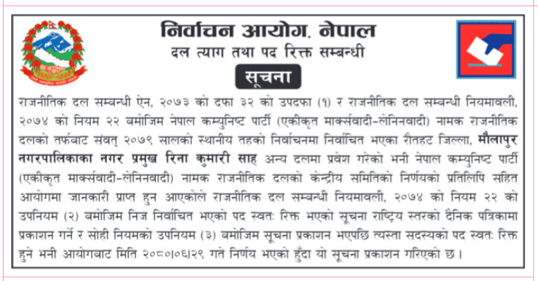 काठमाडौँ । रौतहटको मौलापुर नगरपालिकाका नगरप्रमुख रिनाकुमारी साहको पद गएको छ । मङ्गलबार निर्वाचन आयोगले सूचना जारी गर्दै प्रमुख साहको पद रिक्त भएको जनाएको हो ।