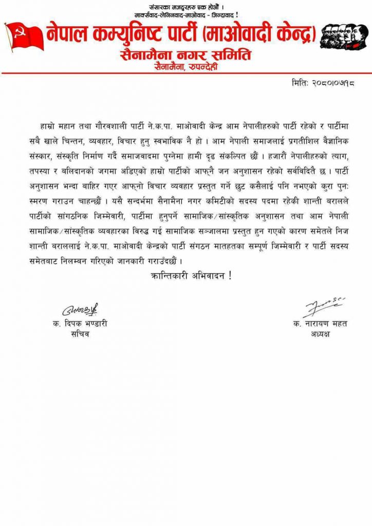 नेकपा माओवादी केन्द्र रूपन्देहीले अनैतिक क्रियाकलाप गरेर चर्चामा आउने शान्ति बराललाई कारबाही गरेको छ ।
