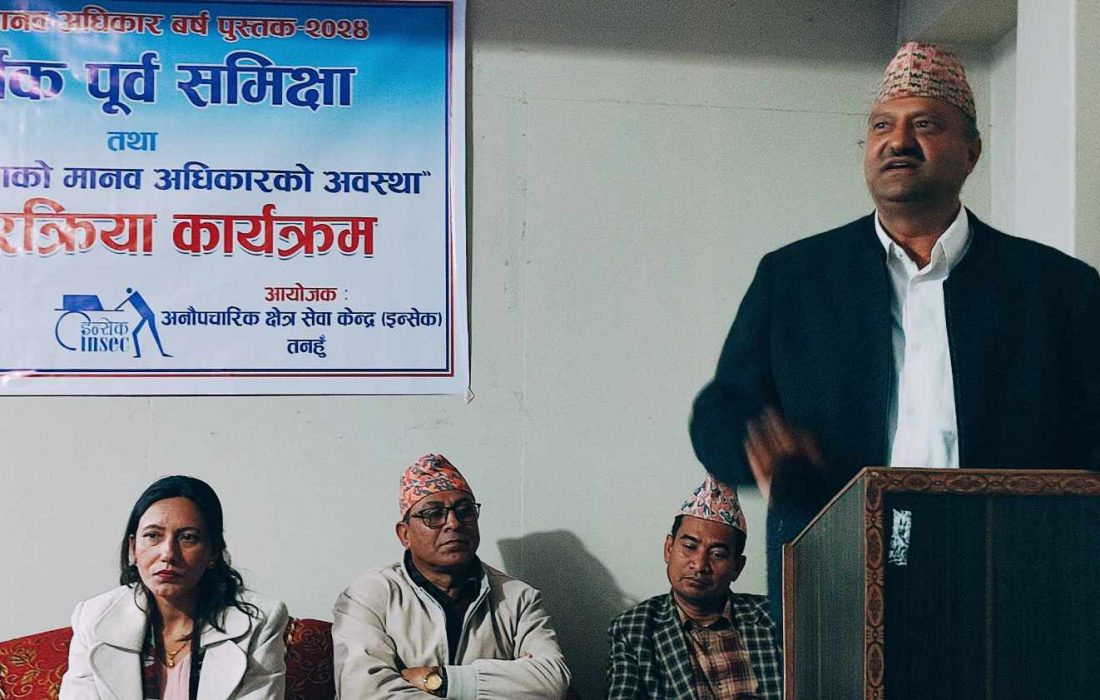 २६ मंसिर । तनहूँ । तनहूँ जिल्लाको मानव अधिकारको अवस्था बारे अनौपचारिक सेवा केन्द्र ईन्सेक तनहूँको दमौलीमा अन्तर्क्रिया कार्यक्रम सम्पन्न भएको छ । मानव अधिकार निगरानी समुहकी सदस्य बसुन्धरा घर्तिको सभापतित्वमा भएको कार्यक्रममा सहायक प्रमुख जिल्ला अधिकारी तथा तनहूँका निमित्त प्रमुख जिल्ला अधिकारी कमलराज भण्डारी, जिल्ला प्रहरी कार्यालय तनहूँका सूचना अधिकारी एवं प्रहरी नायव उपरिक्षक मोहन बहादुर खाँण, नेपाली कांग्रेस तनहूँका प्रवक्ता हरि वाग्ले, नेकपा एमालेका जिल्ला सचिवालय सदस्य सिताराम सुर्खाली, नेकपा माओवादी केन्द्रका जिल्ला सचिवालय सदस्य बसन्त दरै, विभिन्न संघसंस्थाका प्रतिनिधि तथा पत्रकारहरुको उपस्थिति रहेको थियो । नेपाल मानव अधिकार पुस्तक बर्गा २०२४ तथा तनहूँ जिल्लाको मानव अधिकारको अवस्था बारे आयोजित अन्तर्क्रिया कार्यक्रममा अनौपचारिक सेवा केन्द्र ईन्सेक तनहूँका प्रतिनिधि प्रकाशचन्द्र भट्टराईले तनहूँ जिल्लाको मानवअधिकारको अवस्थाको बारेमा आफ्नो रिर्पोट प्रस्तुत गर्नुभएको थियो ।