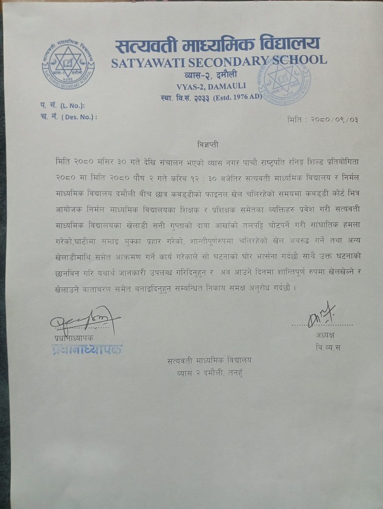 तनहूँ । नियम विपरित निर्मल मा.वि. लाई आयोजक बनाईएको राष्ट्रपति रनिङ शल्डि प्रतियोगिता विवादको घेरामा परेको छ । आयोजक बस्नुपर्ने नगरपालिका सहयोगी बसि एउटा विद्यालयलाई प्रतियोगिता आयोजना गर्न दिदाँ र आयोजक विद्यालयका शिक्षकले प्रतियोगितामा सहभागी विद्यार्थीमाथि भौतिक आक्रमण गर्दा प्रतियोगिता विवादमा परेको हो । नगरपालिकाले आयोजक बनाएको निर्मल मा.वि. मा प्रतियोगिता भईरहदा उक्त विद्यालयका शिक्षक बिरेन्द्र काफ्ले दलबल सहित मैदानमा प्रवेश गरि आयोजक विद्यालयसग प्रतिष्पर्धा गरेको विद्यालय सत्यवती मा.वि.का विद्यार्थीलाई घाटीमा घोक्रयाउनका साथै प्रहार गरेको कारण सत्यवती मा.वि. का विद्यार्थी सनि गुप्ताको आँखा नजिक चोट लागेको छ ।