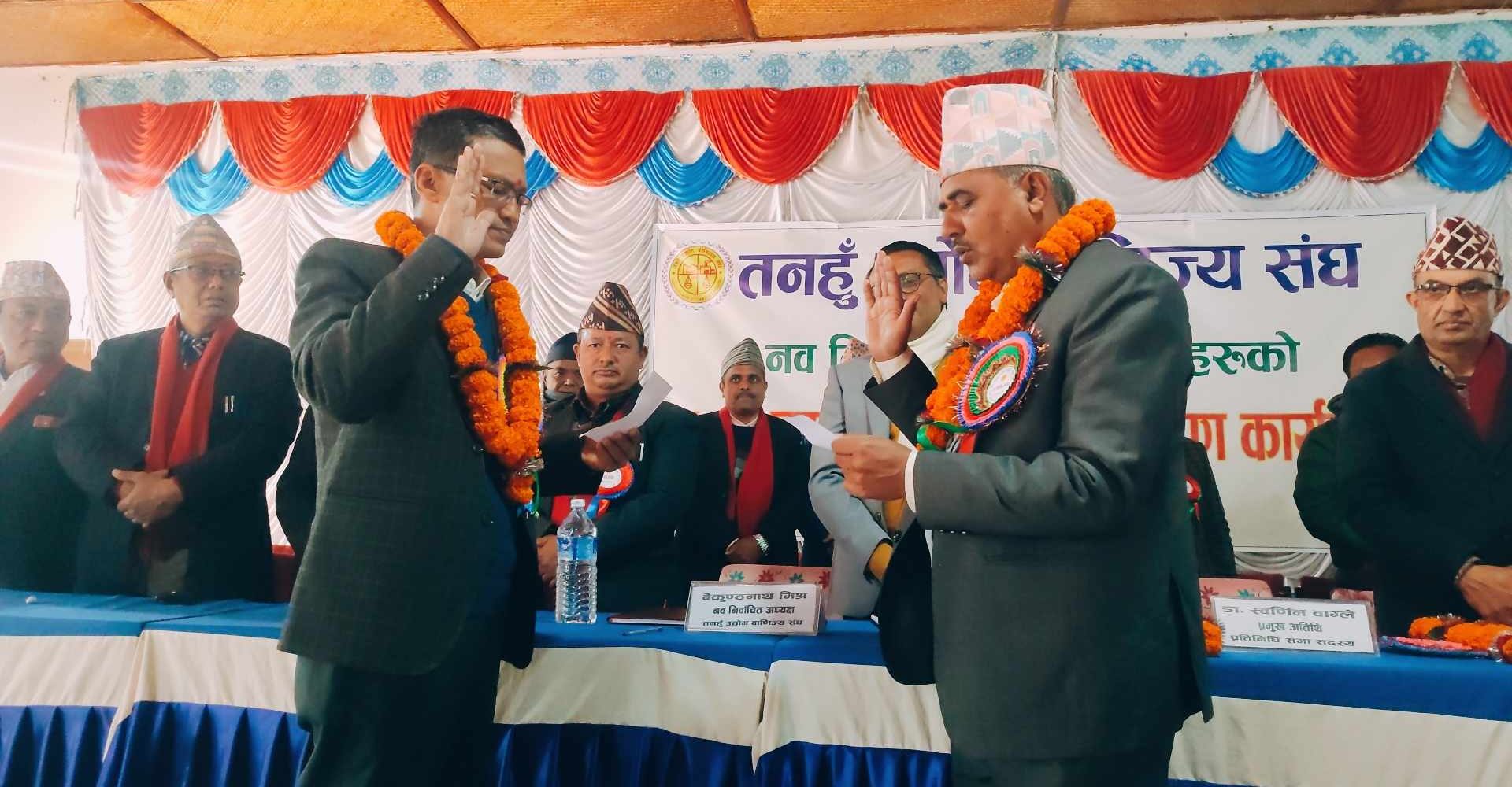 कार्यक्रममा तनहुँ उद्योग बाणिज्य संघका नवनिर्वाचित अध्यक्ष बैकुण्ठनाथ मिश्रलाई अघिल्लो कार्यकालका अध्यक्ष पविन्द्र कुमार श्रेष्ठले सपथ ग्रहण गराउनुभएको थियो । सपथ ग्रहण पश्चात नवनियुक्त अध्यक्ष बैकुण्ठनाथ मिश्रले वरिष्ठ उपाध्यक्ष ईमकुमार मल्ल,प्रथम उपाध्यक्ष कुमार मल्ल, द्रितिय उपाध्यक्ष दिनेशकुमार श्रेष्ठ लगायतका पदाधिकारीहरुलाई सपथ ग्रहण गराउनुभएको थियो ।