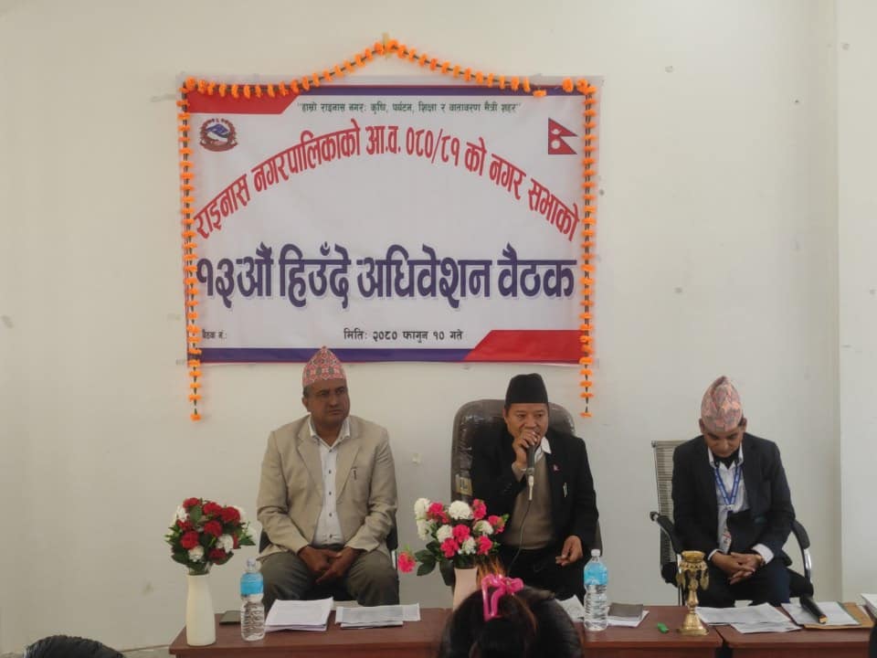 राइनास नगरपालिका प्रमुख खड्गवहादुर गुरुङको अध्यक्षतामा भएको अधिवेशनमा नगर उपप्रमुख पुष्पराज खनालले चालु आर्थिक वर्ष २०८०/०८१ को अर्थ वार्षिक प्रगति प्रतिवेदन प्रस्तुत गर्नुभएको थियो ।
