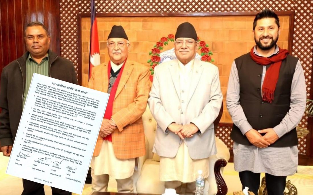 काठमाडौं । नयाँ गठबन्धनमा आबद्ध चार राजनीतिक दलहरुबीच ८ बुँदे लिखित सहमति भएको छ ।