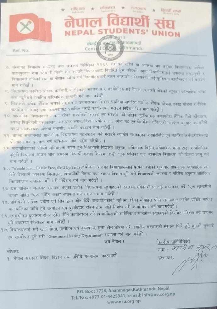 संघका अनुसार विद्यार्थीले विद्यालय जाँदा शैक्षिक सामग्रीहरू बोक्ने झोलाको वजन घटाउन, प्रविधिसँग अभ्यस्त आजका विद्यार्थीको रुझान समेतलाई ख्याल गरी प्रविधिमैत्री पाठ्यपुस्तक सिकाइमा अधिकतम प्रविधिको प्रयोग र प्रत्येक विद्यार्थीलाई पाठ्यपुस्तक र शैक्षिक सामग्री सुरक्षित राख्न विद्यालय हाता भित्रै उचित प्रबन्ध मिलाइनु पर्ने देखिन्छ । यस अलावा विद्यालयहरू आफैले पाठ्यपुस्तक तथा स्टेशनरी बिक्री गर्न नपाउने विद्यालयबाट निर्धारित ड्रेस कोडको नमुना विद्यार्थीहरुलाई उपलब्ध गराउनुपर्ने र विद्यालयले तोकेको स्थानमा पोशाक खरिद गर्न विद्यार्थीहरूलाई बाध्य नगराउने भन्ने व्यवस्थालाई पूर्णरुपमा कार्यान्वयन गराउने लगायतका विभिन्न मागहरु ज्ञापनपत्र मार्फत पेश गरिएकाे संघका केन्द्रीय सदस्य कैनीले जानकारी दिएका छन् ।