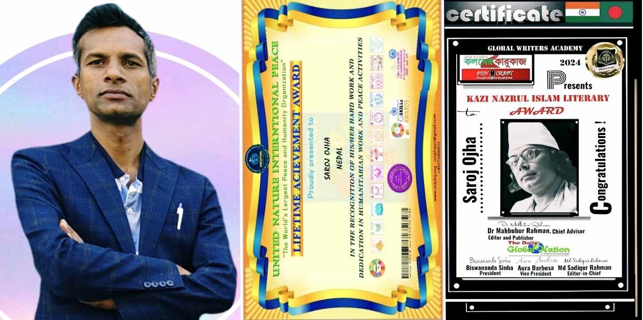 काठमाडौं, जेठ १४ । नेपालका कवि, पत्रकार तथा शान्ति प्रबद्र्धक सरोज ओझाले एकै दिन दुईवटा प्रतिष्ठित सम्मान प्राप्त गरेका छन् । ओझालाई अन्तर्राष्ट्रिय साहित्यिक संस्था ग्लोबल राइटर्स एकेडेमी इण्डिया, द डेली ग्लोबल नेसन बंगलादेश र द पेनक्राफ्ट बंगलादेशले काजी नजरुल इस्लाम साहित्यिक पुरस्कार प्रदान गरेका छन् भने अन्तर्राष्ट्रिय शान्ति र मानवीय संस्था, युनाइटेड नेचर इन्टरनेशनल पीसले लाईफ टाईम एचिभमेण्ट अवार्डबाट विभुषित गरेको छ ।