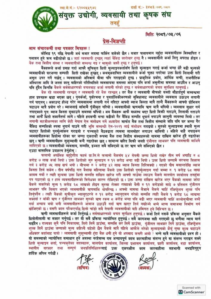 तनहुँ । तनहुँका बैक तथा वित्तिय संस्थाहरुले ऋणीहरुको उठिवास लगाउन खोजेको संयुक्त उद्योगी, व्यवसायी तथा कृषक संघ तनहुँको भनाई रहेको छ । बैकहरुले ऋणीहरुप्रति गरेको अन्यायको बर्णन गर्दै जारी गरिएको एक प्रे विज्ञप्तिमा बैकहरुले ऋणीलाई अपराधीको जस्तो वयवहार गरेको आरोप लगाएका छन् । विज्ञप्तिमा उनीहरुले राज्यका कुनै पनि निकायमा, तिरो तिर्ने ठाउँमा, सम्पत्ति कर तिर्ने ठउँमा, पुंजीगत लाभकर तिनें ठाउँमा, रजिष्ट्रेशन शुल्क तिने ठाउँमा जग्गाको मूल्य कहिल्यै घटेको छैन बैंकले मात्रै पहिले आफैले गरेको मूल्याइनको कैयौ गुणा मूल्य घटाएर ऋणीलाई अप्ठ्यारोमा पारेको छ । के कति कारणले घट्यो धितो राखिएको वस्तुको मुल्य केहि जवाफ नदिईकन कसरी हुन्छ यहि मौका हो ऋण लिनेहरु अप्ठ्यारोमा परेका छन् यीनीहरुलाई सुकम्वासी बनाएर लखेट्न्पर्छ भन्ने ध्याउन्नमा लागेका छन् । विज्ञप्तिमा कुनै पनि ऋणीको चाहना हुदैन कि ऋण नतिरौ र आफ्नो बदनामी होस् , सबैजना ढुक्कग ऋण तिर्न चाहन्छन् तर विषम परिस्थितिलाई ख्याल नगरिकन यीनीहरुलाई गाहे परेको छ जसरी पनि कुम्ल्याउनुपर्छ भनेर बैक तथा वित्तिय संस्थाहरुले लाभकर लगायतका सम्पूर्ण करहरु पनि व्यवायीहरुबाट नै असुल्ने लगायतका घोर अन्यायपुर्ण कार्यहरु गरिरहेका छन् । ऋण लिएपछि तिर्नुपर्छ तर गारो परेको बेला उद्योगी, व्यवसायी तथा कृषकलाई घाँटी न्याँक्न तम्सने प्रवृत्ति उचित होईन त्यसैले यो समस्याको न्यायोचित समाधान हुने अवस्था नरहेसम्म बैक तथा वित्तिय संस्थाका अन्यायपूर्ण काम कारबाहीमा संलग्न हने वा संलग्न गराइन सक्ने धितो मूल्या्न कर्ता, पञ्चकृतेका सदस्यहरू, मालपोत कार्यालय, जिल्ला प्रशासन कार्यालय, प्रहरी कार्यालय, वडा कार्यालय, स्थानीय सरकार तथा सम्पूर्ण जनप्रतिनिधिहरूलाई उक्त एकपक्षीय काम कारवाहीमा सहभागी नभइदिनु हुन पनि उहाँहरुले अपिल गर्नुभएको छ ।