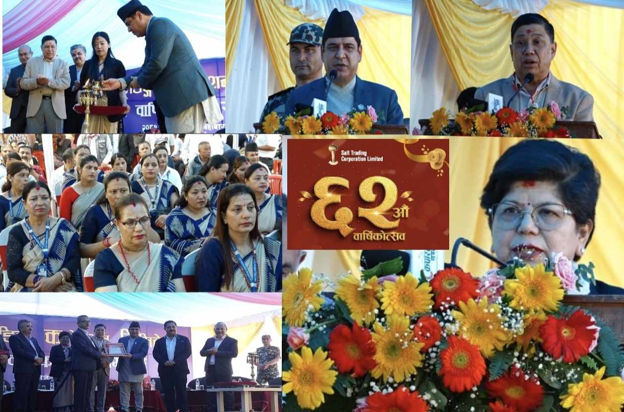 काठमाडौं । साल्ट ट्रेडिङ कर्पोरेशन लिमिटेडले आफ्नो ६२औँ वार्षिकोत्सव समारोह सम्पन्न गरेको छ । कर्पोरेशनले भाद्र २७ गते बिहिवार मुल समारोह कार्यक्रमसहित आफ्नो वार्षिकोत्सव मनाएको हो । कालिमाटी स्थित केन्द्रिय कार्यालय हातामा आयोजित उक्त कार्यक्रमको समुद्घाटन उद्योग वाणिज्य तथा आपूर्ति मन्त्री दामोदर भण्डारीले गर्नुभएको थियो । कर्पोरेशनका संचालक समिति अध्यक्ष प्रदिपलाल श्रेष्ठको सभाध्यक्षता माझ आयोजित कार्यक्रममा कर्पोरेशनका संचालक समिति सदस्यहरु, प्रमुख कार्यकारी अधिकृत उर्मिला श्रेष्ठ, अन्य वरिष्ठ अधिकारी, शेयर धनी, कर्मचारी परिवार, डिलर, पत्रकार लगायतको उपस्थिती रहेको थियो ।
