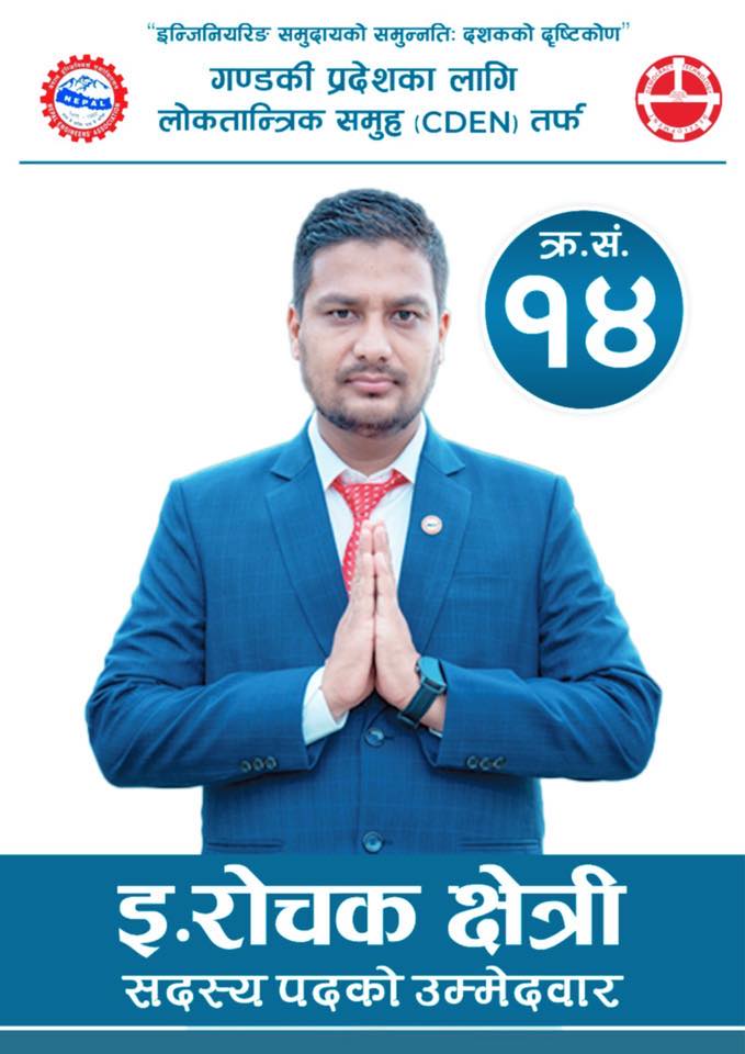 तनहुँ । व्यास नगरपालिकाका ईन्जिनियर रोचक क्षेत्री इन्जिनियरको चुनावमा गण्डकी प्रदेश सदस्य उमेदवार बनेका छन् । नेपाल इन्जिनियर्स एशोसियसनको ३४ औं केन्द्रीय कार्यकारिणी समिति र प्रदेश समितिहरुको समेत एकैपटक शुक्रवार हुने निर्वाचनमा ईन्जिनियर क्षेत्री उमेदवार बनेका हुन् । देशभर १८ हजार ६०१ इन्जिनियर मतदाता रहेको एशोसियसनको चुनावमा व्यास नगरपालिकाका कर्मचारी क्षेत्री लोकतान्त्रिक प्यानलबाट गण्डकी प्रदेश सदस्यको उमेदवार बनेका हुन् । युवा तथा ईन्जिनियरहरुको सुख दुःखमा साथ दिने नेतृत्व आवश्यक भएकोले गण्डकी प्रदेश सदस्य पदमा आफुले अत्याधिक मत पाउने आकांक्षा राखेकोशान्त , सौम्य, कर्तव्यनिष्ठ कर्मचारीको परिचय बनाएका क्षेत्रीले बताएका छन् ।
