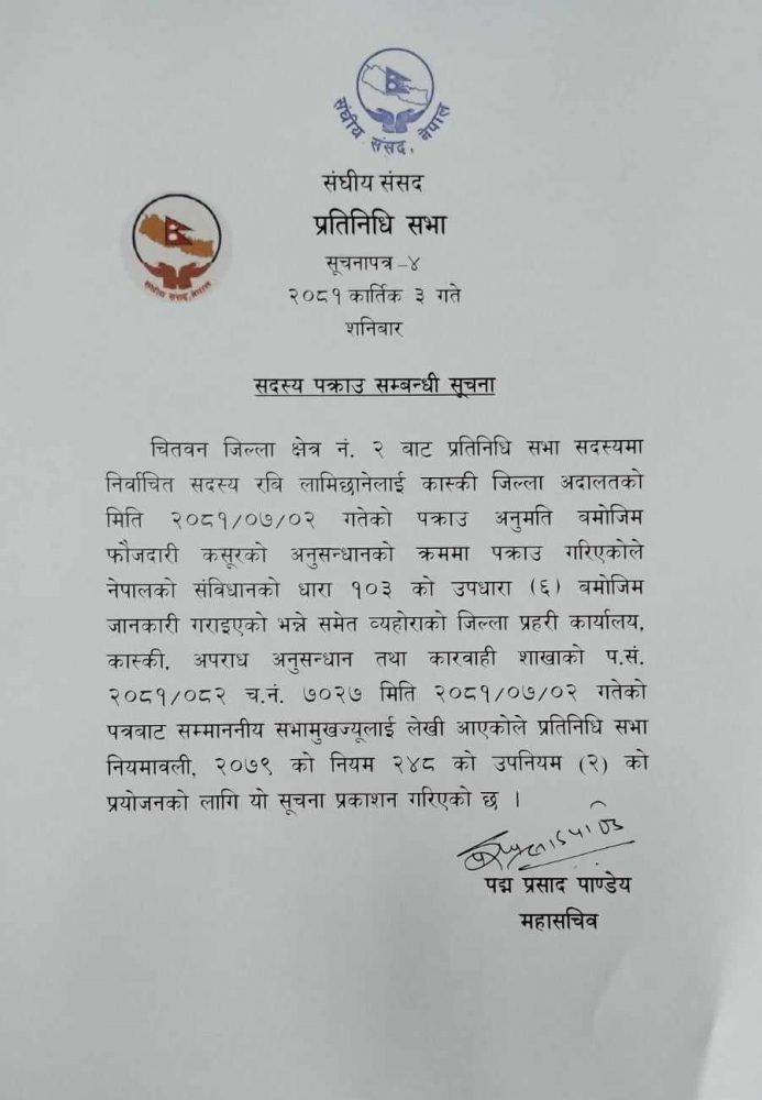 संघीय संसद सचिवालयका महासचिव पद्मप्रसाद पाण्डेयले जारी गरेको विज्ञप्तिमा पनि लामिछानेलाई फौजदारी कसूरको अनुसन्धानको क्रममा पक्राउ गरिएको जानकारी प्रहरीले शुक्रबार नै सभामुखलाई दिएको उल्लेख छ।