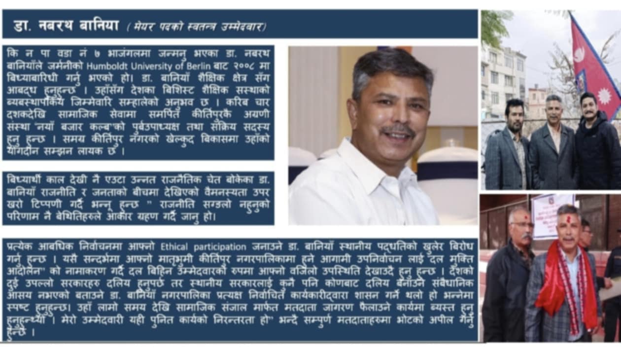 काठमाडौ । कीर्तिपुर नगरपालिकाको मेयर पदमा स्वतन्त्र उम्मेदवारका रूपमा डा नवरथ बानियाँले उम्मेदवारी दिएका छन। काठमाडौँ वडा नं. ७ भाङ्गलमा जन्मिएका डा बानियाँले बर्लिनको प्रतिष्ठित हुम्बोल्ट विश्वविद्यालयबाट २००८ मा विद्यावारिधि गरेका थिए। शैक्षिक क्षेत्रसँग गहिरो सम्बन्ध भएका डा बानियाँले देशका प्रतिष्ठित संस्थाहरूमा जिम्मेवार भूमिकामा काम गरिसकेका छन।