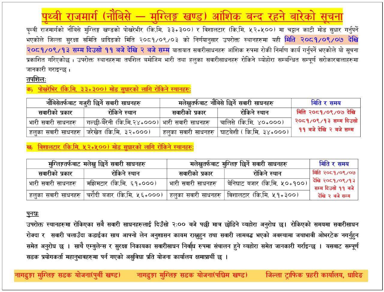 सूचनामा भनिएको छ,‘पृथ्वी राजमार्गको नौबिसे–मुग्लिङ खण्डको पोखरेभीर (कि .मि. ३३ं३००) र विशालटार ९कि.मि. ५२ं५००० मा चट्टान काटी मोड सुधार गर्नुपर्ने भएकाले जिल्ला सुरक्षा समिति धादिङको मिति २०८१/०९/०३ को निर्णयअनुसार उपरोक्त स्थानहरूमा यही मिति २०८१/०९/०७ देखि २०८१/०९/१३ सम्म दिउँसो ११ बजेदेखि २ बजेसम्म यातायात सवारीसाधनहरू आंशिक रूपमा रोकी निर्माण कार्य गर्नुपर्ने भएकोले यो सूचना प्रकाशित गरिएको छ ।’