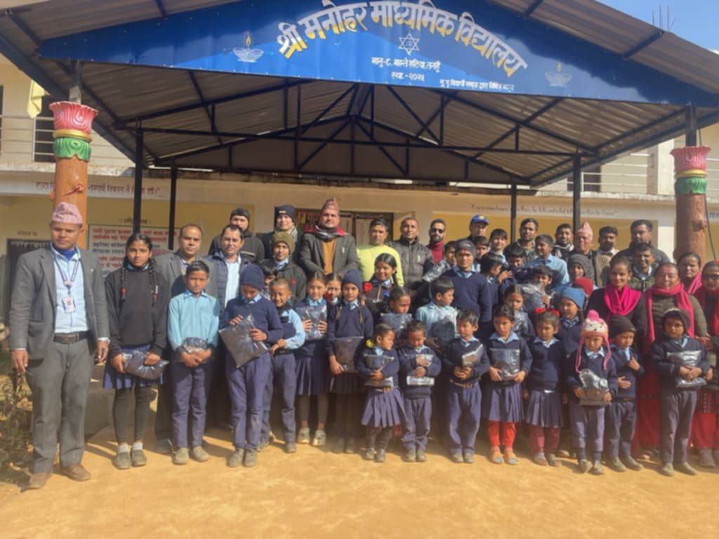 तनहुँ । भानु नगरपालिका वडा नं. ८ महन्तेहटियामा रहेको मनोहर माध्यमिक बिद्यालय भु.पु. बिद्यार्थी समाजले ४५ जना विद्यार्थीलाई न्यानो कपडा ( स्विटर) सहयोग गरेको छ । आफु अध्ययन गरेको विद्यालयलाई सहयोग गर्ने कार्यक्रम अन्तर्गतको दोश्रो कार्यक्रम स्वरुप उक्त विद्यालयमा अध्यनरत न्युन आर्थिक अबस्था भएका ४५ जना बिद्यार्थीहरुलाई न्यानो कपडा (सुइटर) बितरण गरेको हो ।