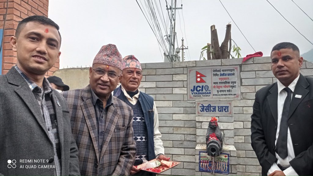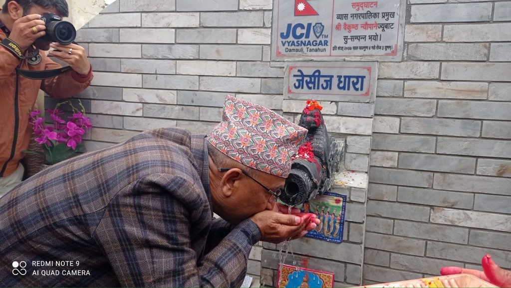 तनहूँ । जेसिआई व्यास नगरले निर्माण गरेको धारा व्यास नगरपालिकाका प्रमुख बैकुण्ठ न्यौपानेले एक कार्यक्रमका बिच उद्घाटन गर्नुभएको छ । व्यास नगरपालिका वडा नं. ३ अनसन चौतारी नजिकै दमौली अस्पताल जाने बाटोमा उक्त धारा निर्माण गरिएको छ ।