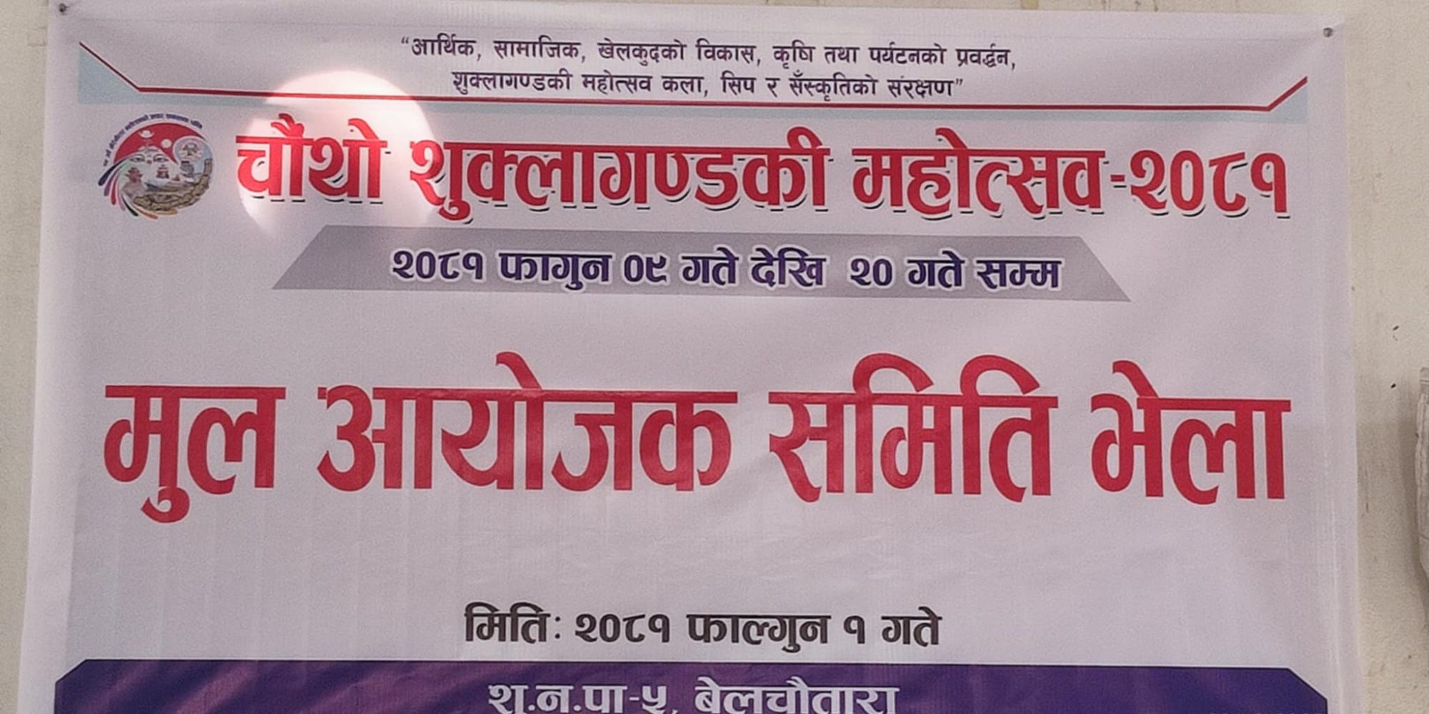 तनहुँ । आगामी फागुन ९ गतेदेखि २० गतेसम्म तनहुँ शुक्लागण्डकीको बेलचौतारामा चौथो शुक्लागण्डकी महोत्सव हुन गईरहेको छ । आर्थिक, सामाजिक, खेलकुदको विकास, कृषि तथा पर्यटनको प्रवर्द्धन, शुक्लागण्डकी महोत्सव कला सिप र सँस्कृतिको संरक्षण’ भन्ने मुल नारका साथ शुक्लागण्डकी नगर उद्योग बाणिजय संघले बेलचौताराको भानुभक्त बहुमुखी क्याम्पस हाता भित्र उक्त महोत्सव आयोजना गर्न लागेको हो । उक्त कुराको आज आयोजित मुल आयोजक समितिको भेलामा जानकारी दिईयो । शुक्लागण्डकी नगरपालिकाका उपप्रमुख खिुमबहादुर बि. .कको प्रमुख आतिथ्यतामा भएको भेलामा शुक्लागण्डकीको पिहचान यसक्षेत्रमा मात्र होई नदेशभर फैलाउनको लागि महोत्सव गर्न लागएको जानकारी दिइर्एको थियो । भेलामा प्रमुख अतिथि बि.क.ले जनताको । शुक्लागण्डकी नगर उद्योग बाणिजय संघका अध्यक्ष एवम् महोत्सवका मुल संयोजक समुन्द्रराम श्रेष्ठको सभापतित्वमा भएको भेलामा महोत्सवमा स्थानीय स्तरमा उत्पादित घरेलु तथा कृषि उपजलाई बिशेष प्राथमिकता दिई निःशुल्क स्टल प्रदान गरिने, स्थानिय व्यापारीहरुलाई २५ प्रतिशत टुटमा स्टल उपलब्ध गराईने, जनमानसमा कसरी भिन्न बनाउने , कसरी सबै जिल्लावासीबिच पहिचान बनाउनुका साथै नगरलिका सतरिय खूल्ला भलिवल प्रतियोगिता आयोजना गर्ने र प्रथम पुरस्कार २ लाख प्रदान गरिने, विद्यालय स्तरिय नृत्य प्रतियोगिता पनि आयेजना गरिने जानकारी प्रदान गरिएको थियो । छ । महोत्सव व्यापारको लागि हो भन्ने भ्रमलाई चिर्नको लागि स्थानिय कला र संस्कृतिलाई प्रमोशन गर्ने लक्ष्य पनि लिईएको बताईएको थियो ।